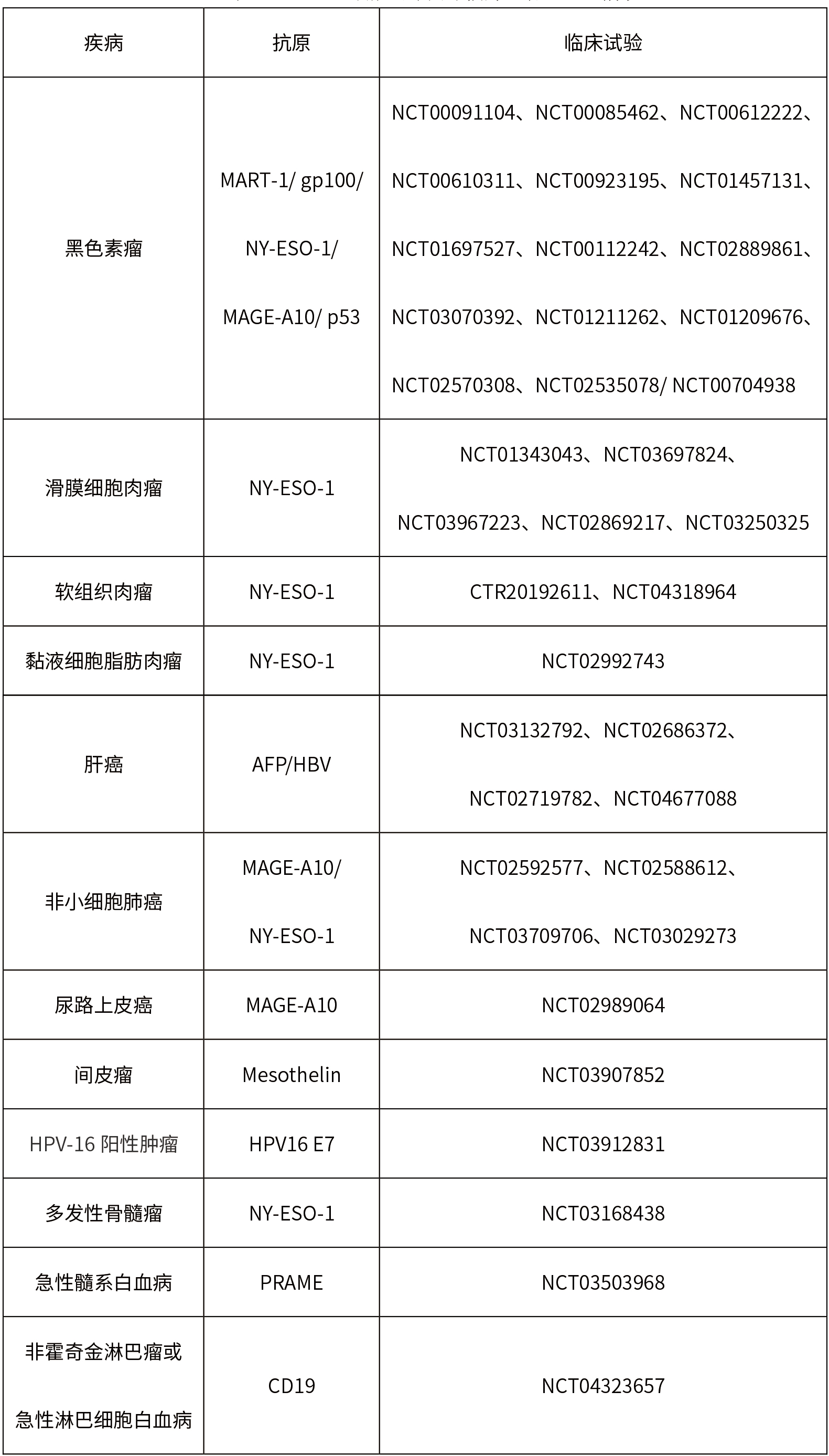 在其他腫瘤如肝癌、肺癌、間皮瘤、尿路上皮癌、食管癌、多發(fā)性骨髓瘤等腫瘤治療中,TCR-T細(xì)胞免疫治療也正在用于臨床研究。