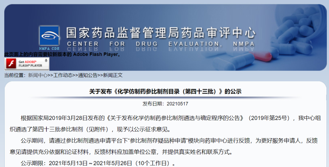 關(guān)于發(fā)布《化學(xué)仿制藥參比制劑目錄(第四十三批)》的公示(征求意見稿)