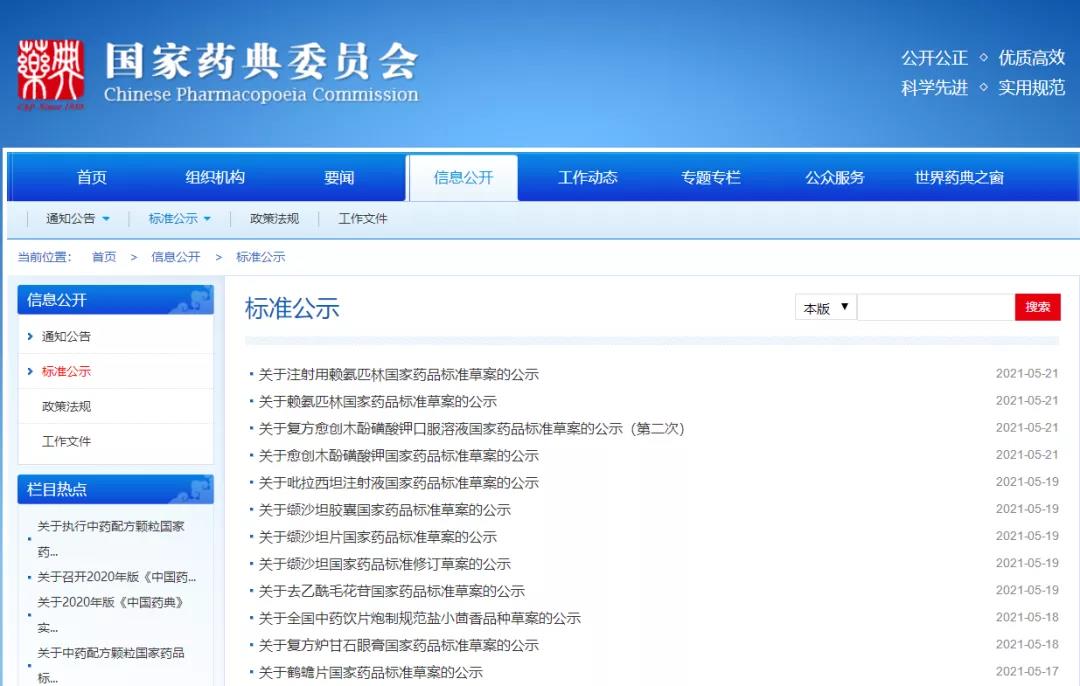 本周去乙酰毛花苷、纈沙坦片、纈沙坦膠囊、吡拉西坦注射液、復(fù)方爐甘石眼膏、鶴蟾片國家藥品標(biāo)準(zhǔn)草案公示;纈沙坦國家藥品標(biāo)準(zhǔn)修訂草案的公示;烏梅炭、蛇蛻、瓜蔞皮、丁香、決明子、炒決明子、萊菔子、蒲黃、生馬錢子、鹽菟絲子、菟絲子、水蛭、葶藶子、芫花、九香蟲、炒九香蟲全國中藥飲片炮制規(guī)范品種草案公示。