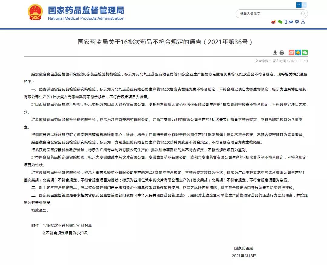 國家藥監局關于16批次藥品不符合規定的通告(2021年第36號)