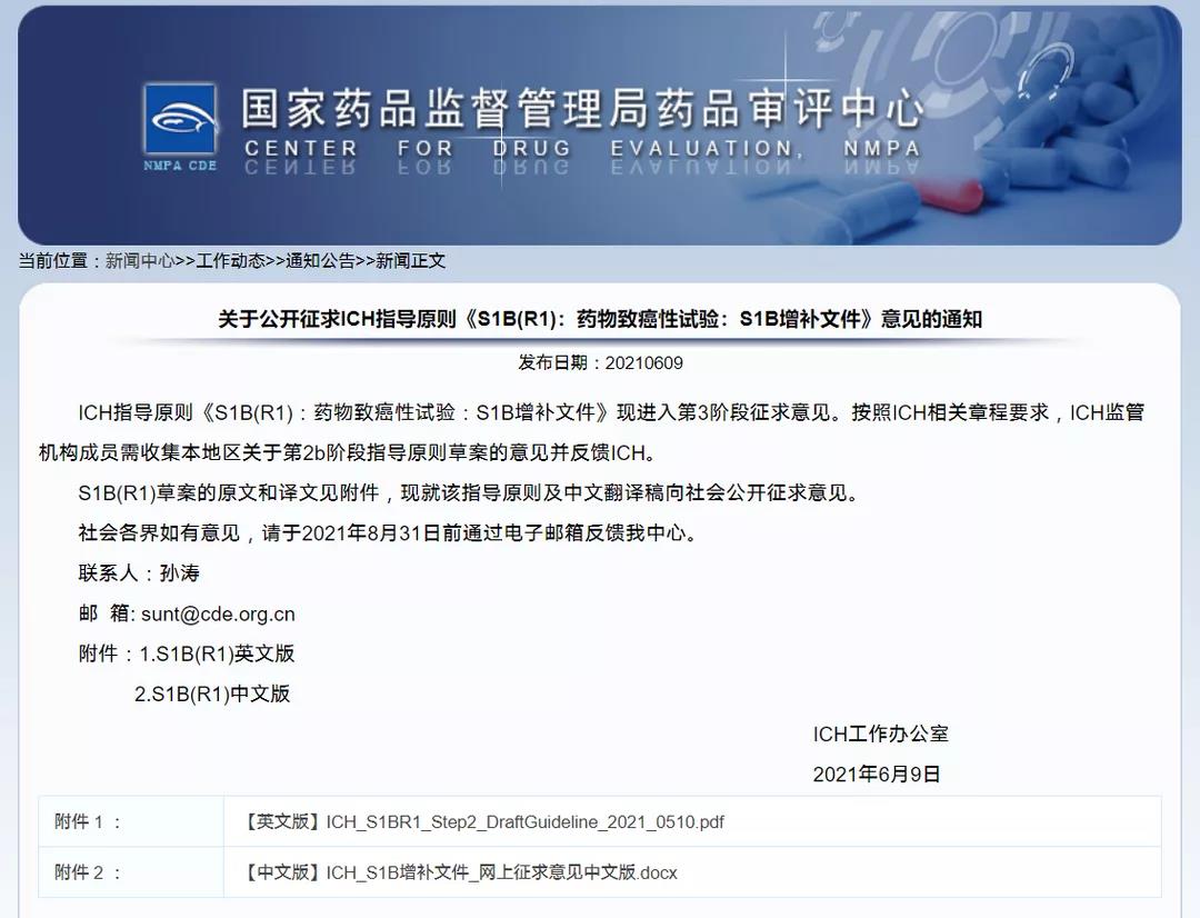 關于公開征求ICH指導原則《S1B(R1):藥物致癌性試驗:S1B增補文件》意見的通知