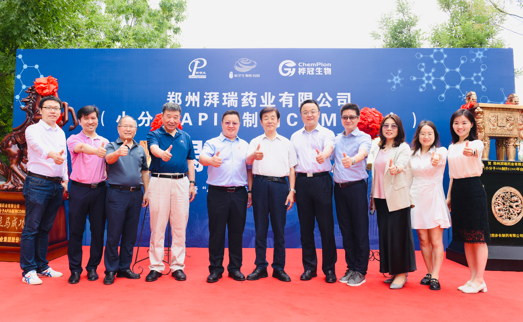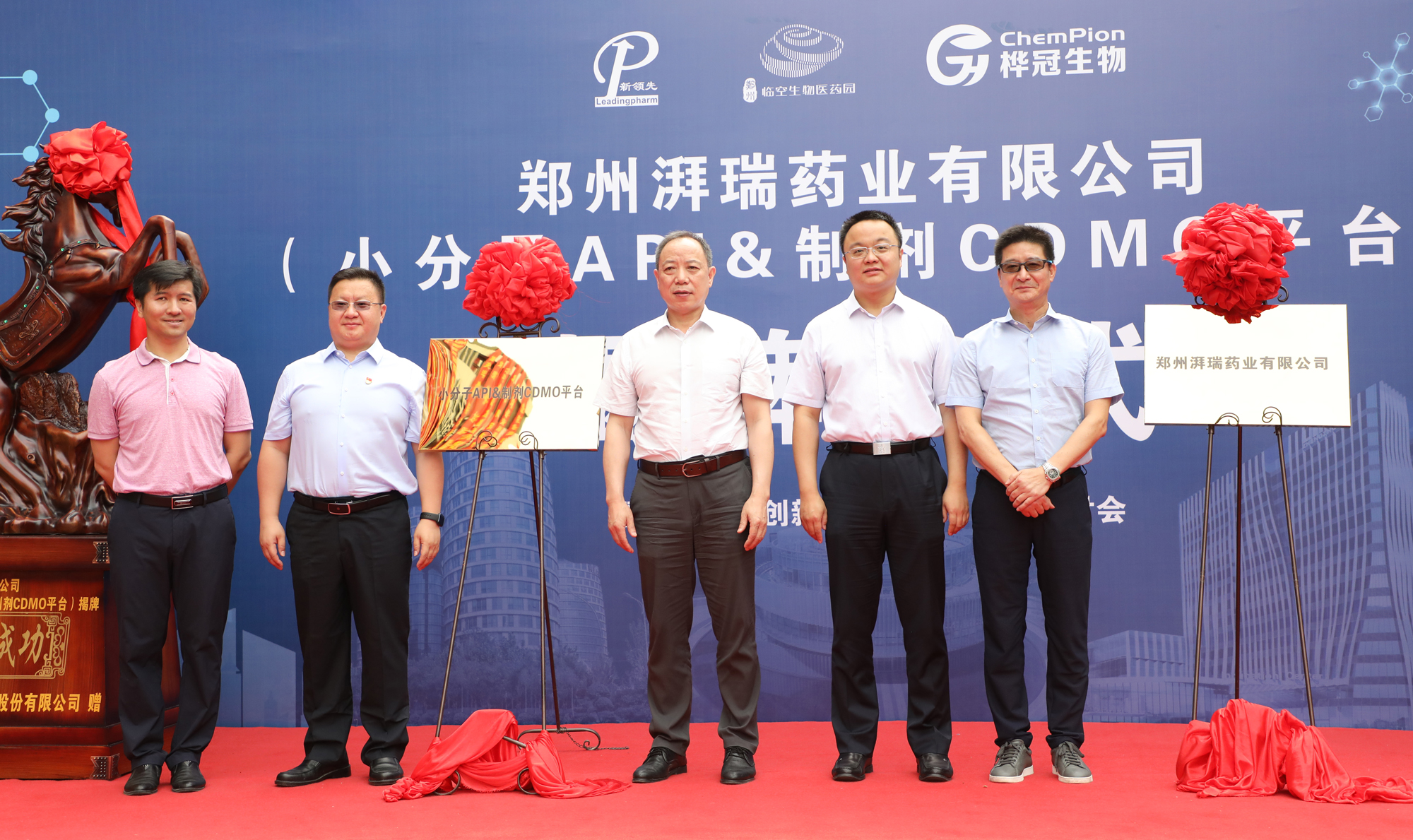 ▲李國輝總監(jiān)(左三)、楊曉峰局長(左二)、柳敬元董事長(左四)、陶新華董事長(左五)為鄭州湃瑞藥業(yè)有限公司和小分子API&制劑CDMO平臺揭牌