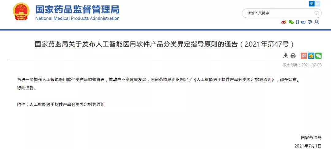 國家藥監局關于發布人工智能醫用軟件產品分類界定指導原則的通告(2021年第47號) (2021-07-08)