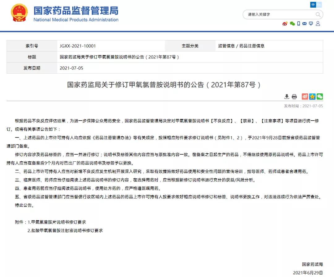 國家藥監局關于修訂甲氧氯普胺說明書的公告(2021年第87號) (2021-07-05)