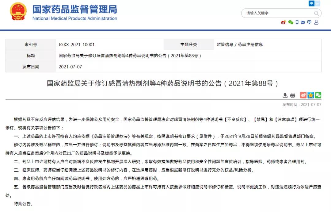 國家藥監局關于修訂感冒清熱制劑等4種藥品說明書的公告(2021年第88號) (2021-07-07)