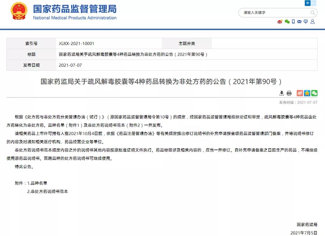 國家藥監局關于疏風解毒膠囊等4種藥品轉換為非處方藥的公告(2021年第90號) (2021-07-07)
