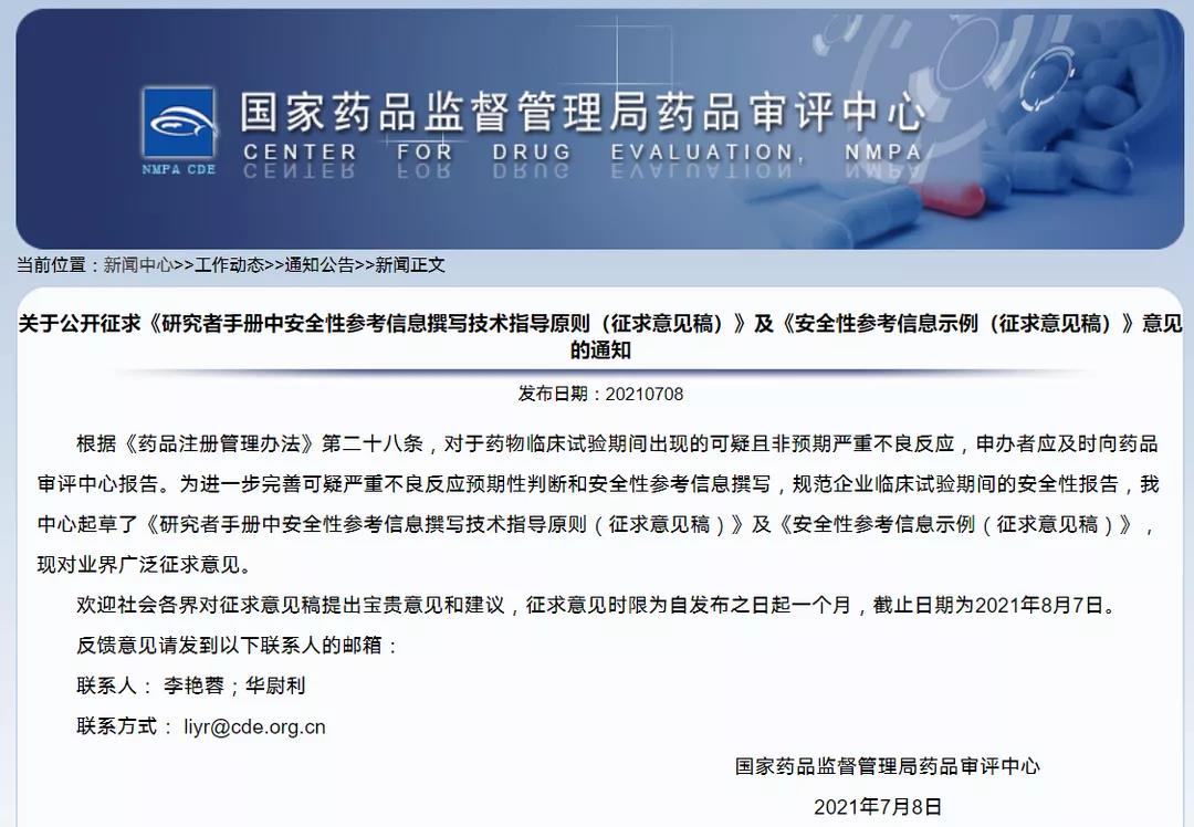 關于公開征求《研究者手冊中安全性參考信息撰寫技術指導原則(征求意見稿)》及《安全性參考信息示例(征求意見稿)》意見的通知