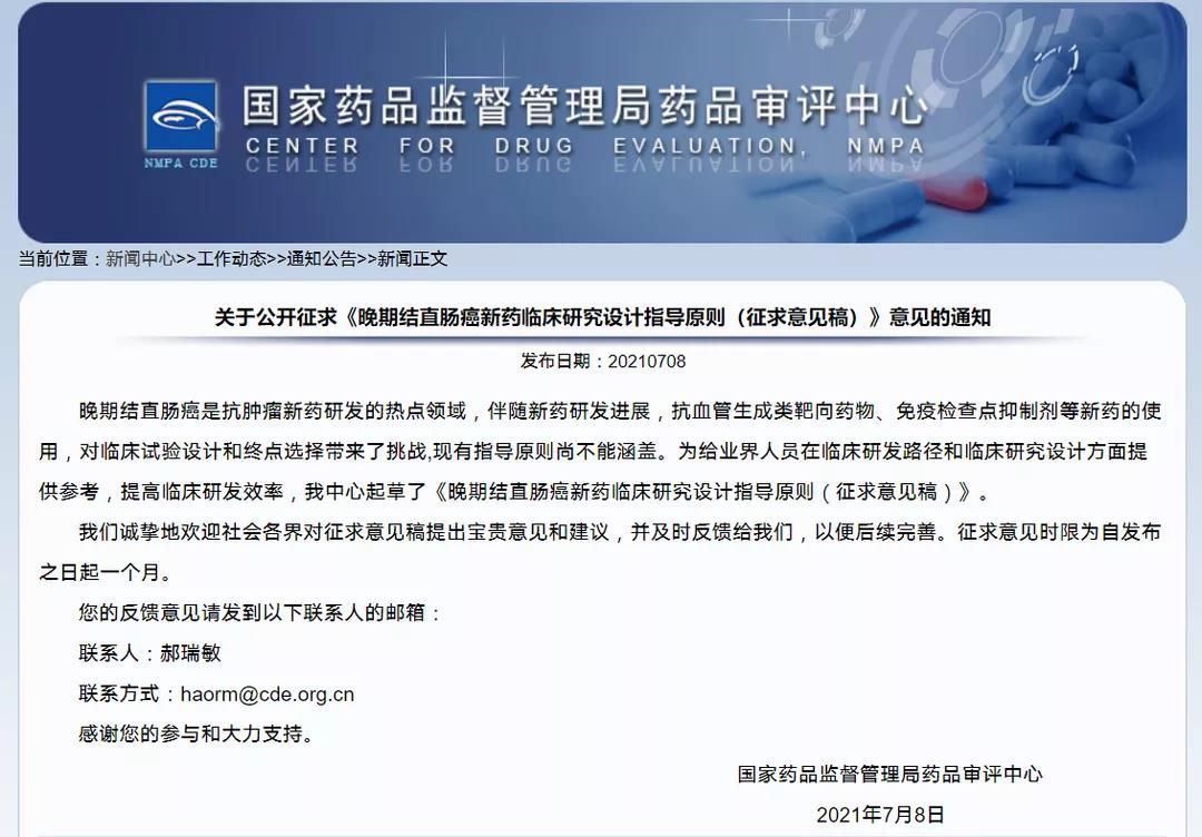 關于公開征求《晚期結直腸癌新藥臨床研究設計指導原則(征求意見稿)》意見的通知