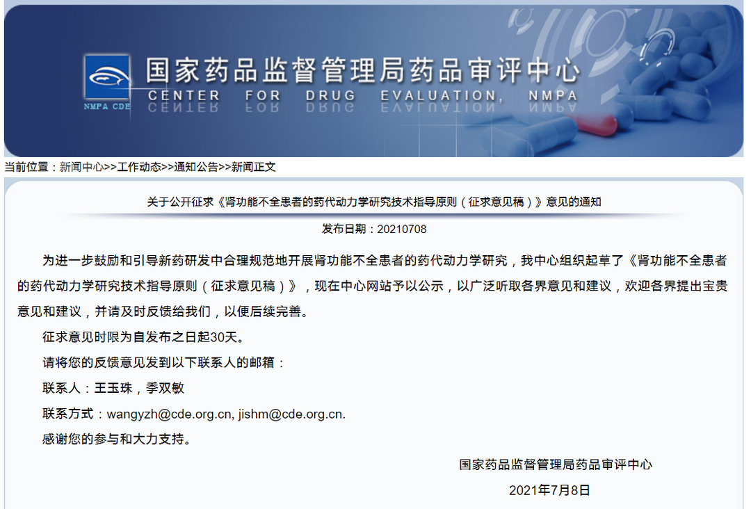 關于公開征求《腎功能不全患者的藥代動力學研究技術指導原則(征求意見稿)》意見的通知