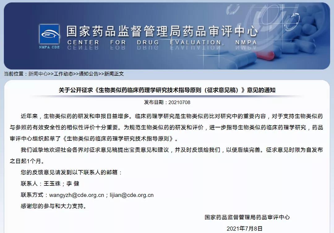關于公開征求《生物類似藥臨床藥理學研究技術指導原則(征求意見稿)》意見的通知