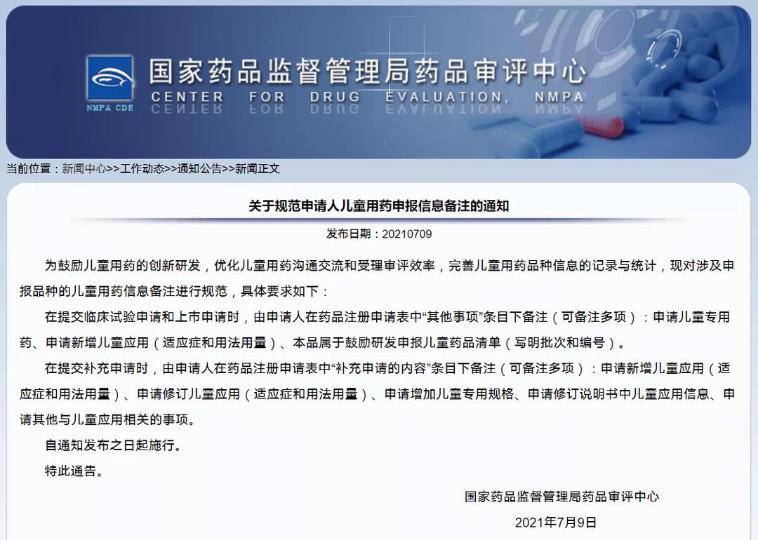 關于規范申請人兒童用藥申報信息備注的通知