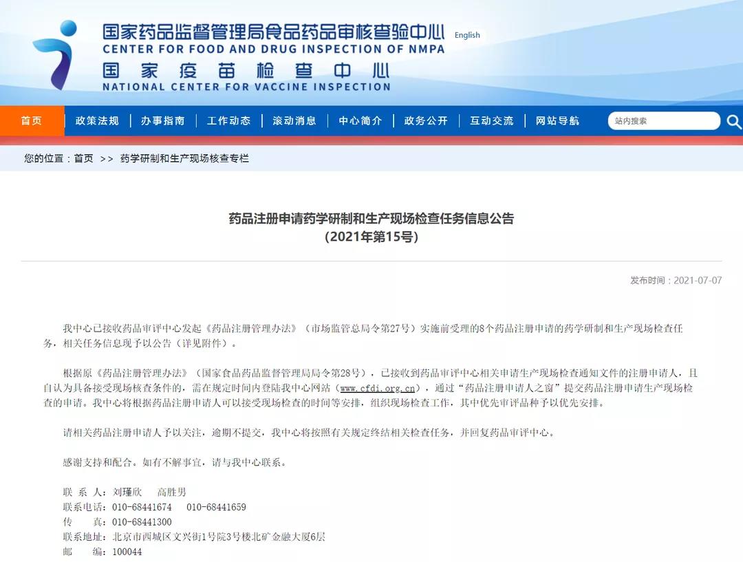 藥品注冊申請藥學研制和生產現場檢查任務信息公告(2021年第15號)