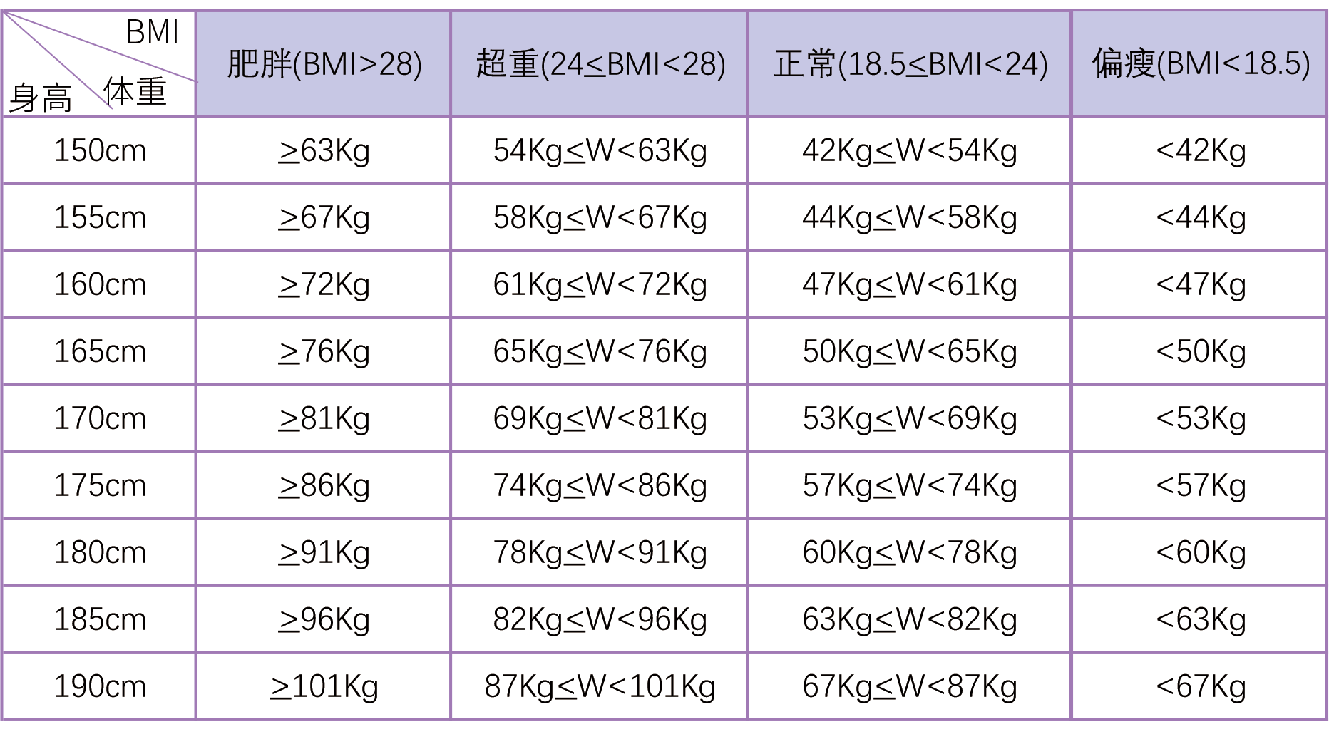 下表了解自己的胖瘦程度