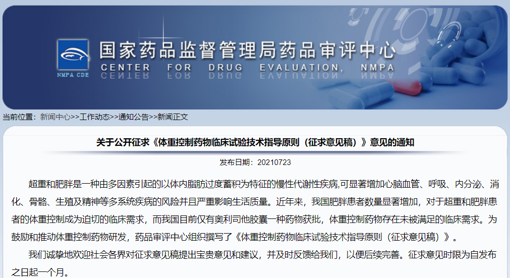 近年來國際上和我國體重控制藥物的研發逐年增多、成為研發活躍的治療領域,但目前國內尚無體重控制藥物的臨床試驗指導原則,為鼓勵和推動體重控制藥物研發,規范臨床研究設計和相關技術要求,CDE近期發布《體重控制藥物臨床試驗技術指導原則》(征求意見稿),供企業和臨床研究單位參考。