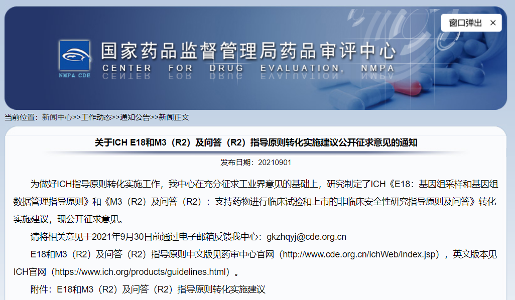 關于ICH E18和M3(R2)及問答(R2)指導原則轉化實施建議公開征求意見的通知