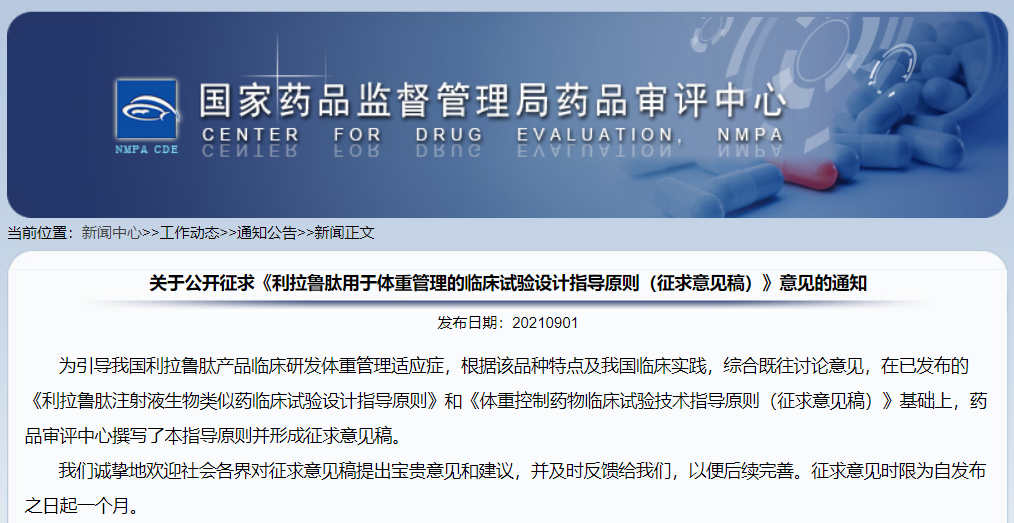 關于公開征求《利拉魯肽用于體重管理的臨床試驗設計指導原則(征求意見稿)》意見的通知