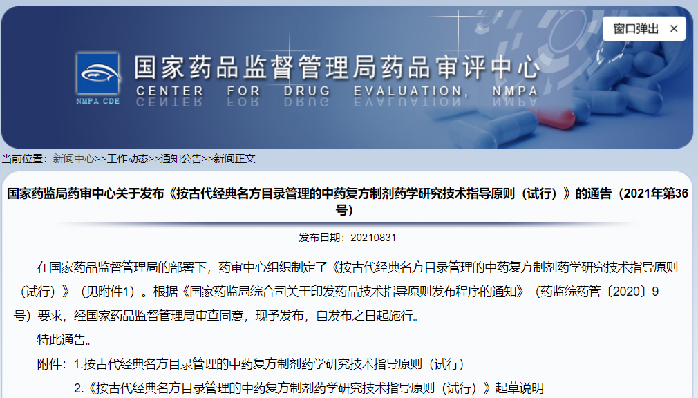 關于發布《按古代經典名方目錄管理的中藥復方制劑藥學研究技術指導原則(試行)》的通告(2021年第36號)