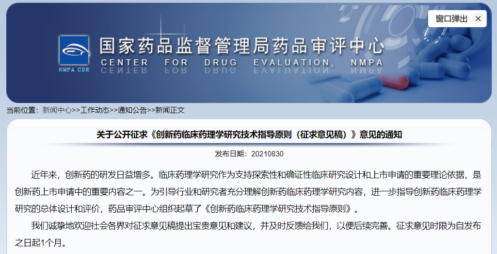 關于公開征求《創新藥臨床藥理學研究技術指導原則(征求意見稿)》意見的通知