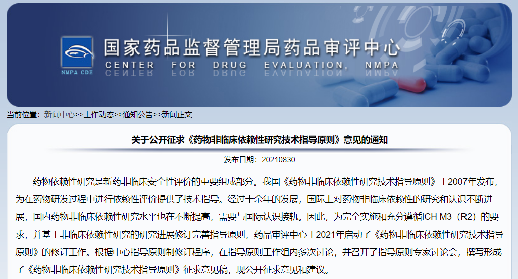 關于公開征求《藥物非臨床依賴性研究技術指導原則》意見的通知