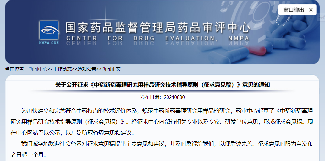 關于公開征求《中藥新藥毒理研究用樣品研究技術指導原則(征求意見稿)》意見的通知