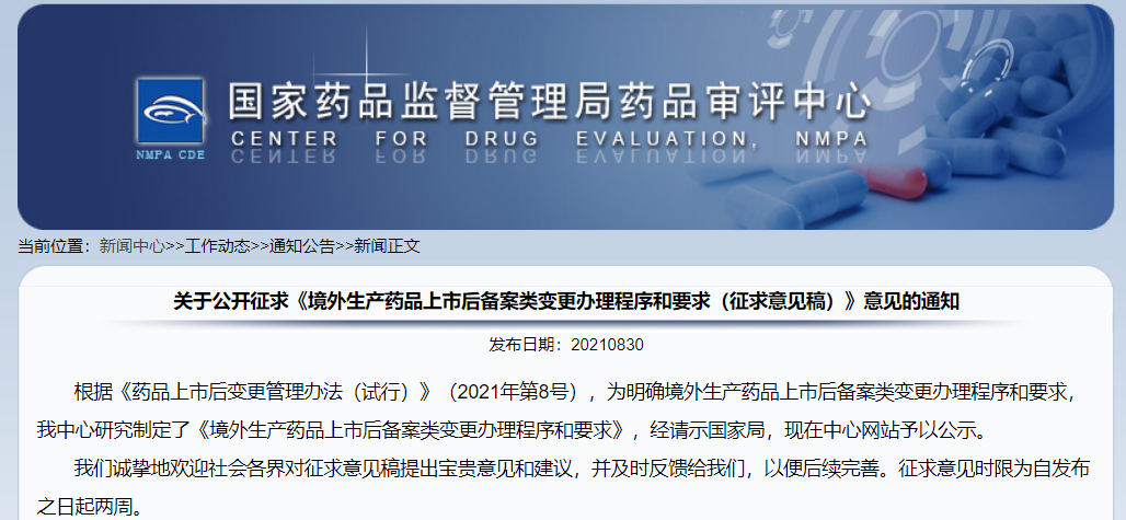 關于公開征求《境外生產藥品上市后備案類變更辦理程序和要求(征求意見稿)》意見的通知
