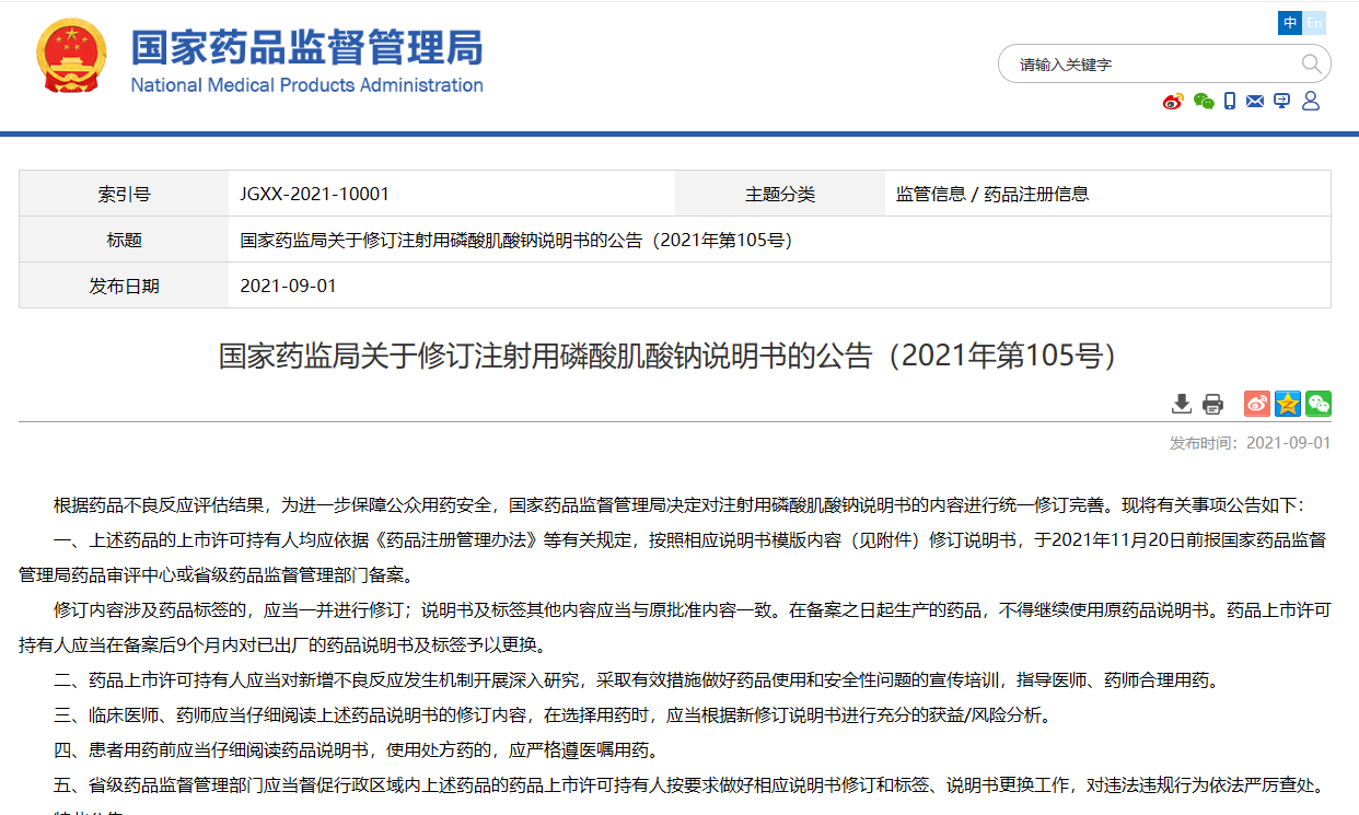 關于修訂注射用磷酸肌酸鈉說明書的公告(2021年第105號)