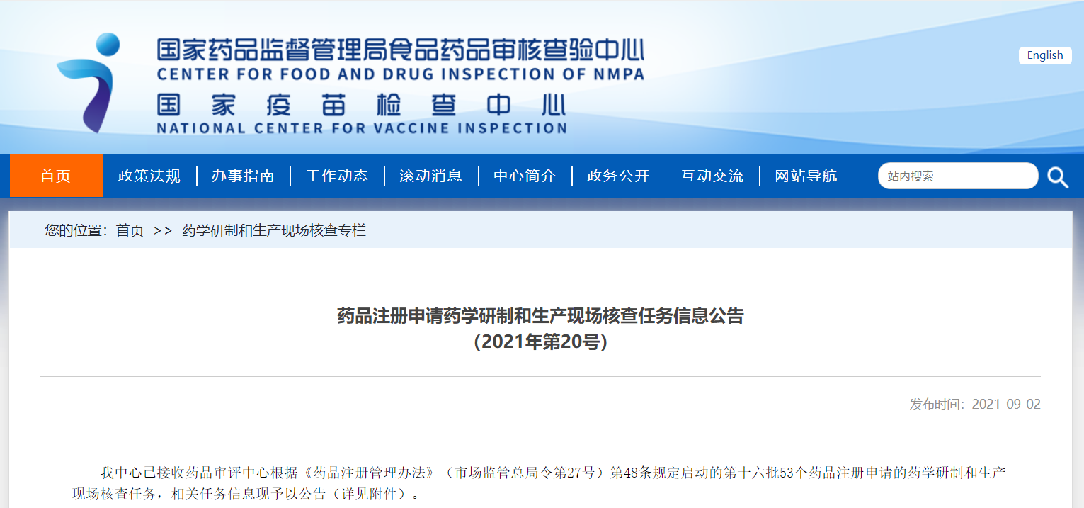 藥品注冊申請藥學研制和生產現場核查任務信息公告(2021年第20號)