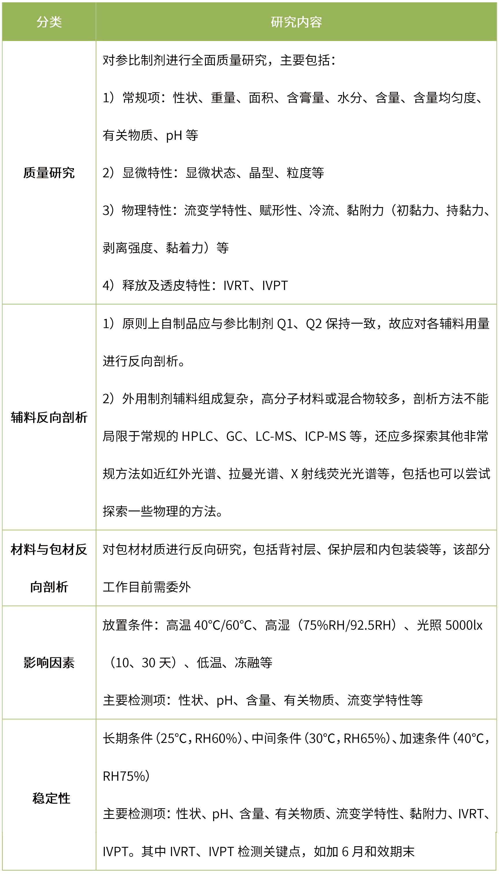 對小試放大樣品進行全面質量研究,包括常規項(性狀、含膏量、水分、含量、含量均勻度、有關物質、pH等)、顯微特性(顯微狀態、晶型、粒度等)、流變學特性、賦形性、冷流、黏附力(初黏力、持黏力、剝離強度、黏著力)、IVRT、IVPT等,各質量屬性應與參比制劑一致。