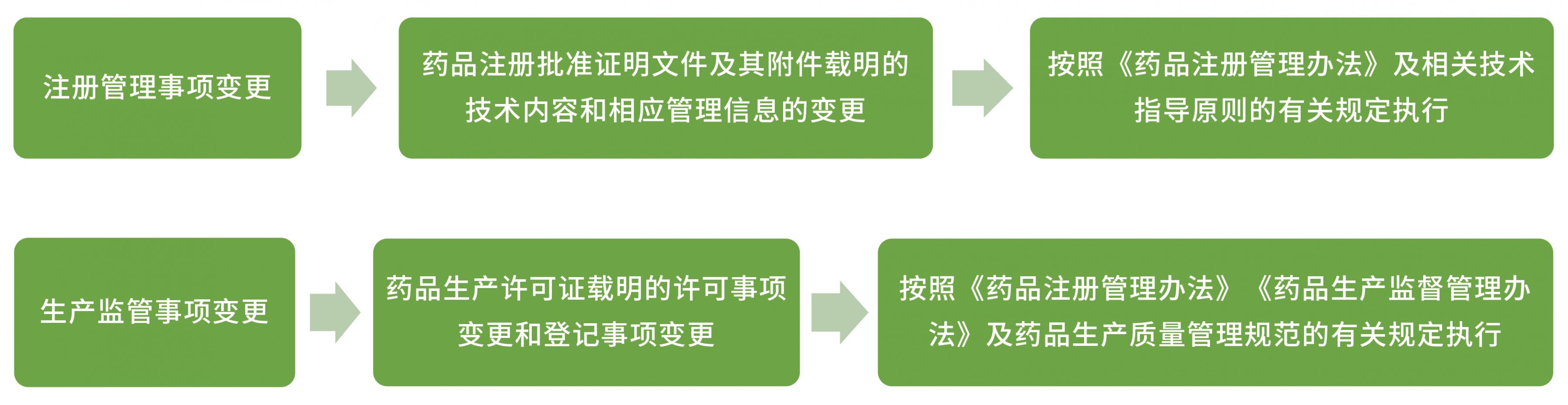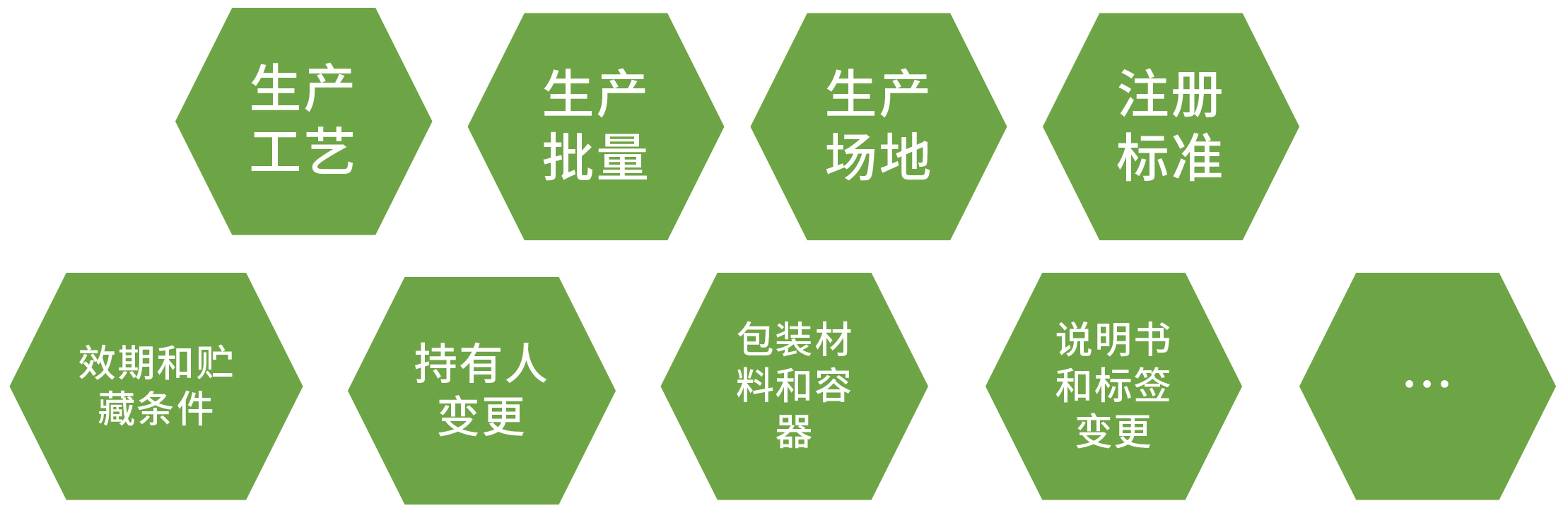 藥品上市后變更包括注冊管理事項變更和生產監管事項變更,也就是涉及注冊批件和生產許可證相關事項的變更。依據變更對藥品安全性、有效性和質量可控性的風險和產生影響的程度,將變更劃分為審評類變更,備案類變更和報告類變更。