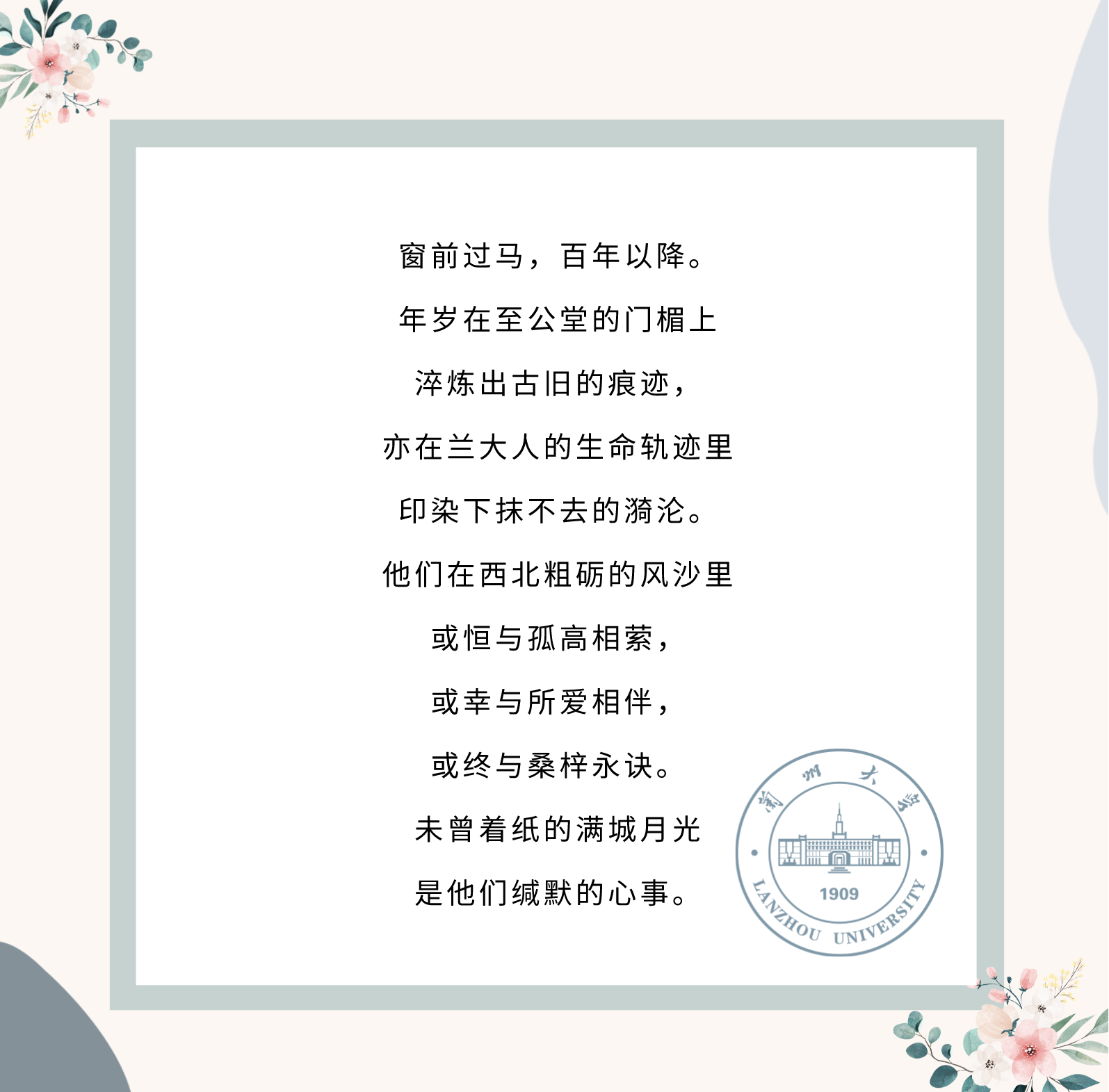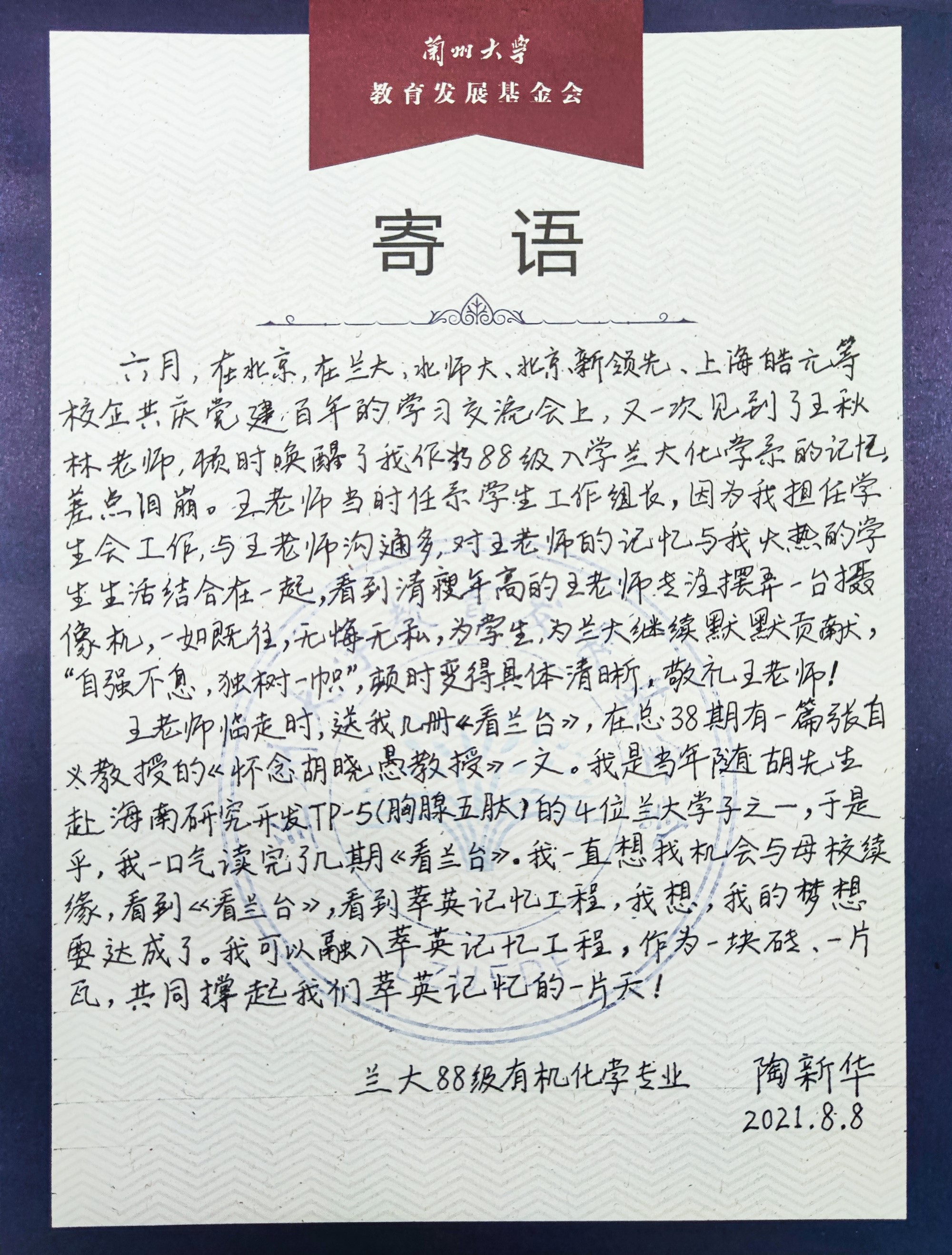 陶總談到,在蘭大求學(xué)的四年間,正是世界觀和人生觀重塑的階段,在母校“自強不息、獨樹一幟”的校風(fēng)校訓(xùn)的熏陶下,養(yǎng)成了獨立思考的人格和不屈的奮斗精神,在人生漫長的歲月中,無論身在何處、境遇如何,母校永遠是一個取之不盡用之不竭的力量源泉。追憶學(xué)校經(jīng)歷,陶總還特別感謝了給予他人生指引和生活幫助的老師和同學(xué)們,讓他度過了令人懷念的大學(xué)時光。飲水思源,我們深切感謝母校的培育,也密切關(guān)注母校的建設(shè)和發(fā)展,呼吁更多的蘭大學(xué)子為母校貢獻綿薄之力!