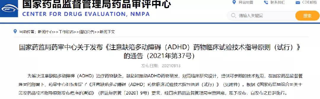 關于發布《注意缺陷多動障礙(ADHD)藥物臨床試驗技術指導原則(試行)》的通告(2021年第37號)