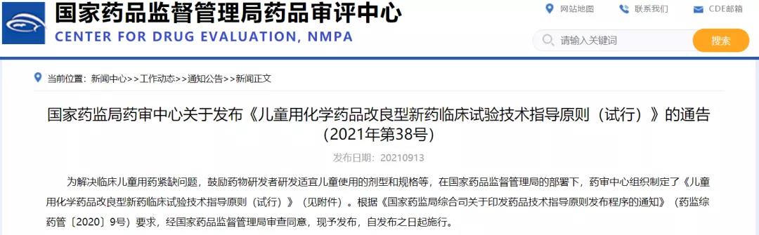 關于發布《兒童用化學藥品改良型新藥臨床試驗技術指導原則(試行)》的通告(2021年第38號)