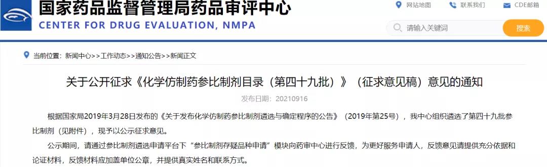 關于公開征求《化學仿制藥參比制劑目錄(第四十九批)》(征求意見稿)意見的通知