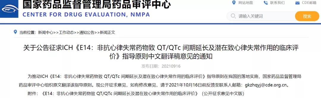 關于公告征求ICH《E14:非抗心律失常藥物致 QT/QTc 間期延長及潛在致心律失常作用的臨床評價》指導原則中文翻譯稿意見的通知
