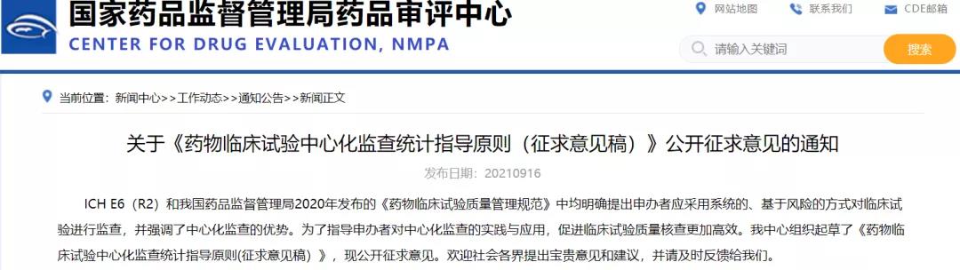 關于《藥物臨床試驗中心化監查統計指導原則(征求意見稿)》公開征求意見的通知