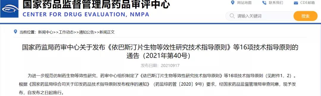 關于發布《依巴斯汀片生物等效性研究技術指導原則》等16項技術指導原則的通告(2021年第40號)