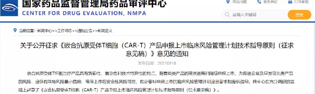 關于公開征求《嵌合抗原受體T細胞(CAR-T)產品申報上市臨床風險管理計劃技術指導原則(征求意見稿)》意見的通知