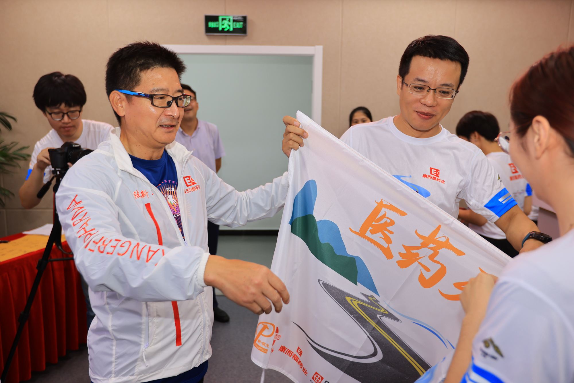 ▲醫藥天團越山向海發起人、新領先醫藥董事長陶新華先生分別向各戰隊授予“醫藥天團”旗幟