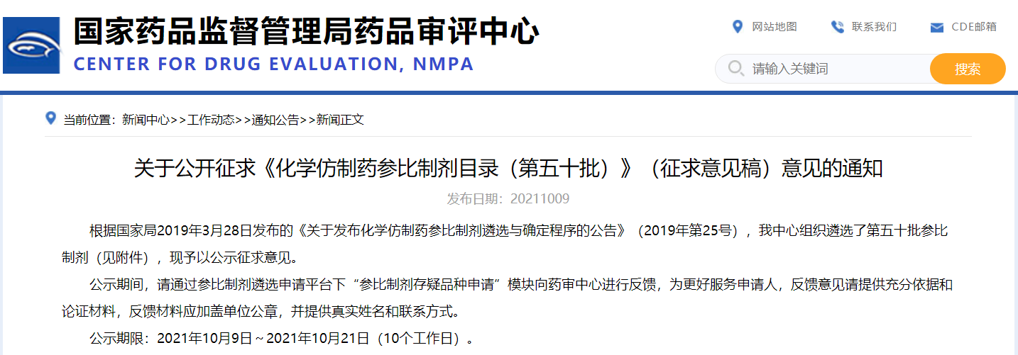 關于公開征求《化學仿制藥參比制劑目錄(第五十批)》(征求意見稿)意見的通知