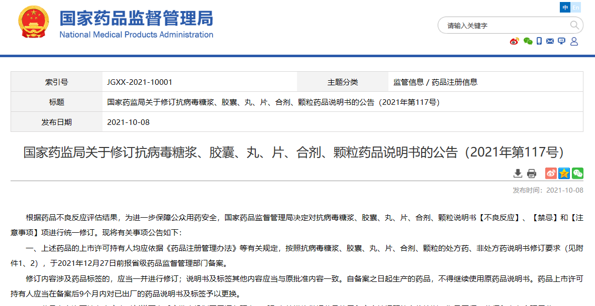 國家藥監局關于修訂抗病毒糖漿、膠囊、丸、片、合劑、顆粒藥品說明書的公告(2021年第117號)