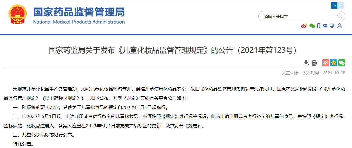 國家藥監局關于發布《兒童化妝品監督管理規定》的公告(2021年第123號