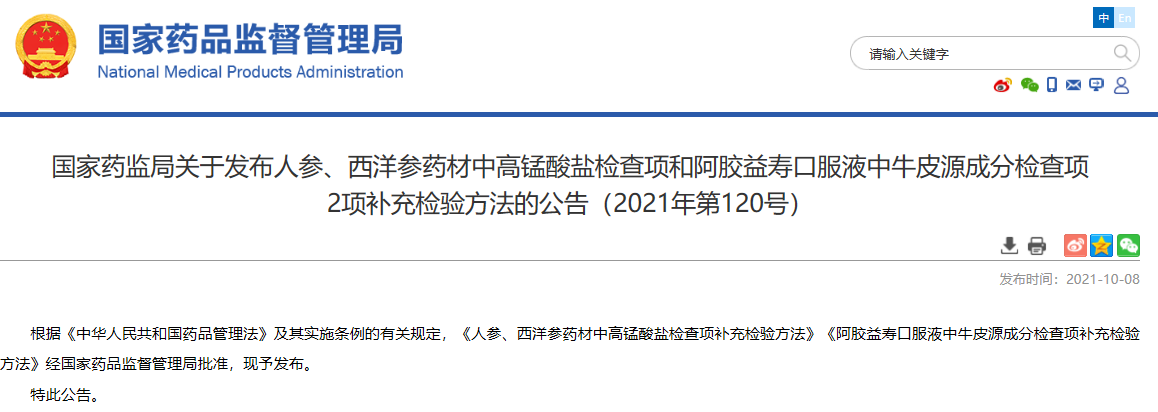 國家藥監局關于發布人參、西洋參藥材中高錳酸鹽檢查項和阿膠益壽口服液中牛皮源成分檢查項2項補充檢驗方法的公告(2021年第120號)