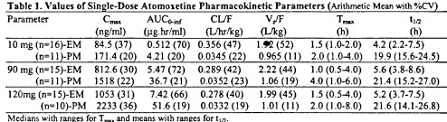 托莫西汀在體內主要由CYP2D6酶代謝,兩種不同代謝的受試者PM(慢代謝者)和EM(快代謝者)對于藥物的吸收也不同,結果如下: