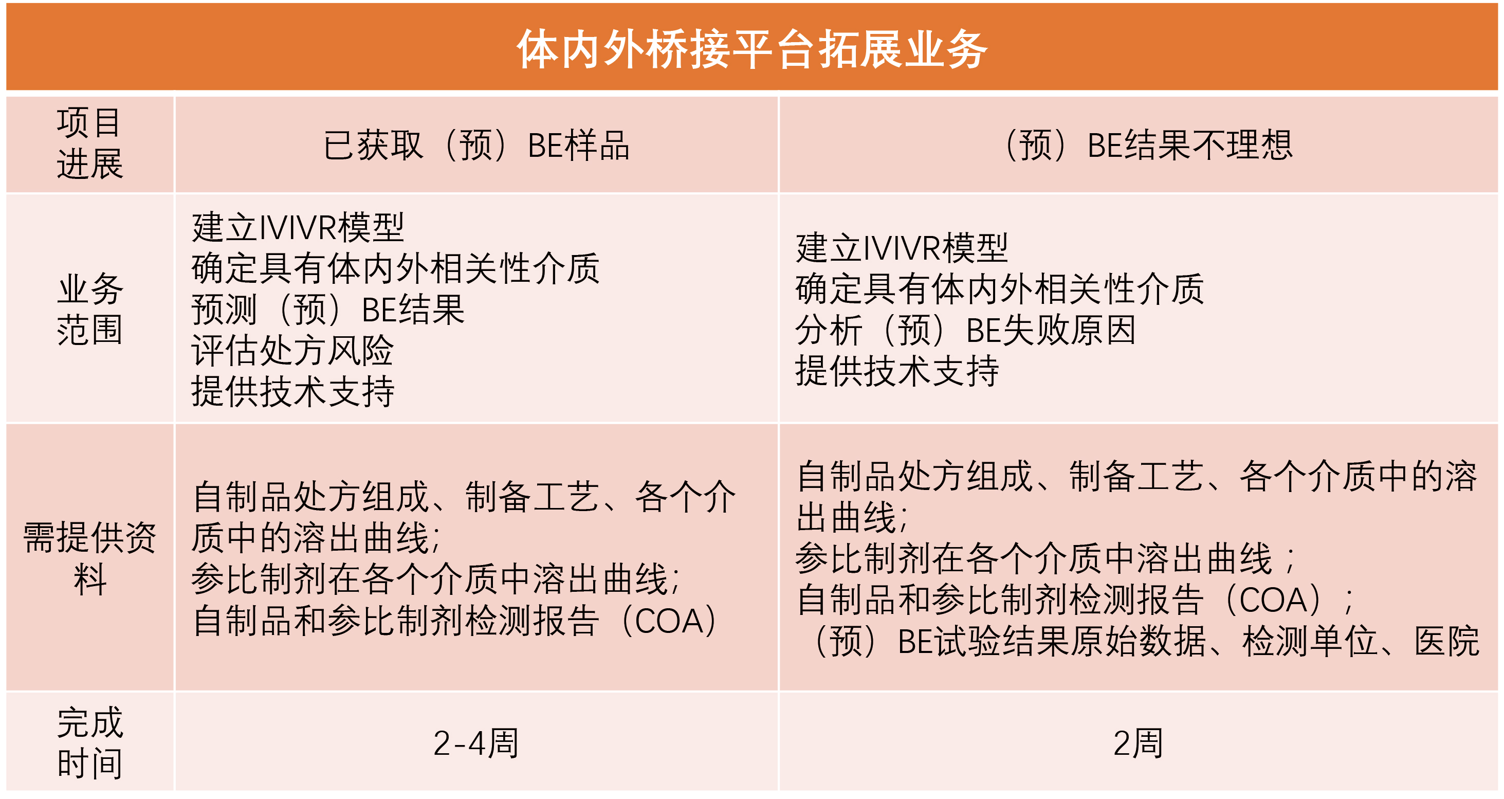 公司體內外橋接(IVIVR)平臺作為國內首家IVIVR平臺,已被納入中關村高精尖產業協同創新平臺體系。該平臺實現了體外藥學和體內藥動學的科學橋接:利用體內外相關性模型技術,使用體外溶出數據預測藥物在體內吸收情況。可明確項目在開發過程中的藥學目標,提高仿制藥的生物等效性試驗(BE試驗)的成功率,縮短藥物的研發時間,節約產品開發成本。
