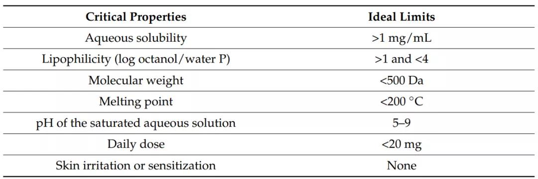 如圖3所示,一般來講,要求原料藥水溶性大于1毫克每毫升,分子量小于500,熔點小于200攝氏度,并且其飽和溶解度pH落在5-9之間,每日最大給藥劑量不超過20毫克,且原料藥本身不對皮膚產(chǎn)生任何致敏作用[4]。