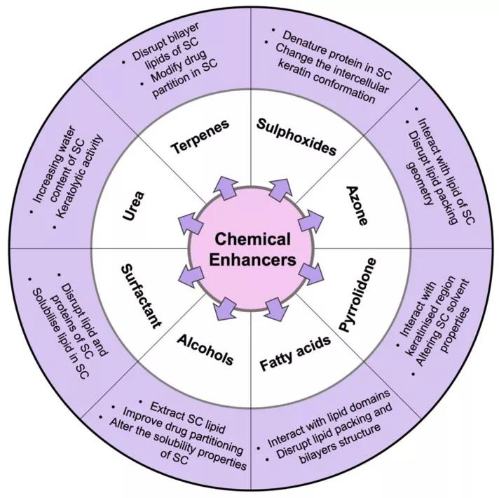 圖5為我們展示了在化學促滲技術中較常使用的物質,包括醇類,脂肪酸,吡咯烷酮,氮酮,亞砜,表面活性劑,尿素和萜烯類化合物。這些化合物的作用機理常常是改變皮下組織的理化性質,比如改變水油分配比,改變磷脂層的結構,失活相應調(diào)控蛋白,進一步地,使得藥物活性成分進入人體吸收的比例增加[3]。