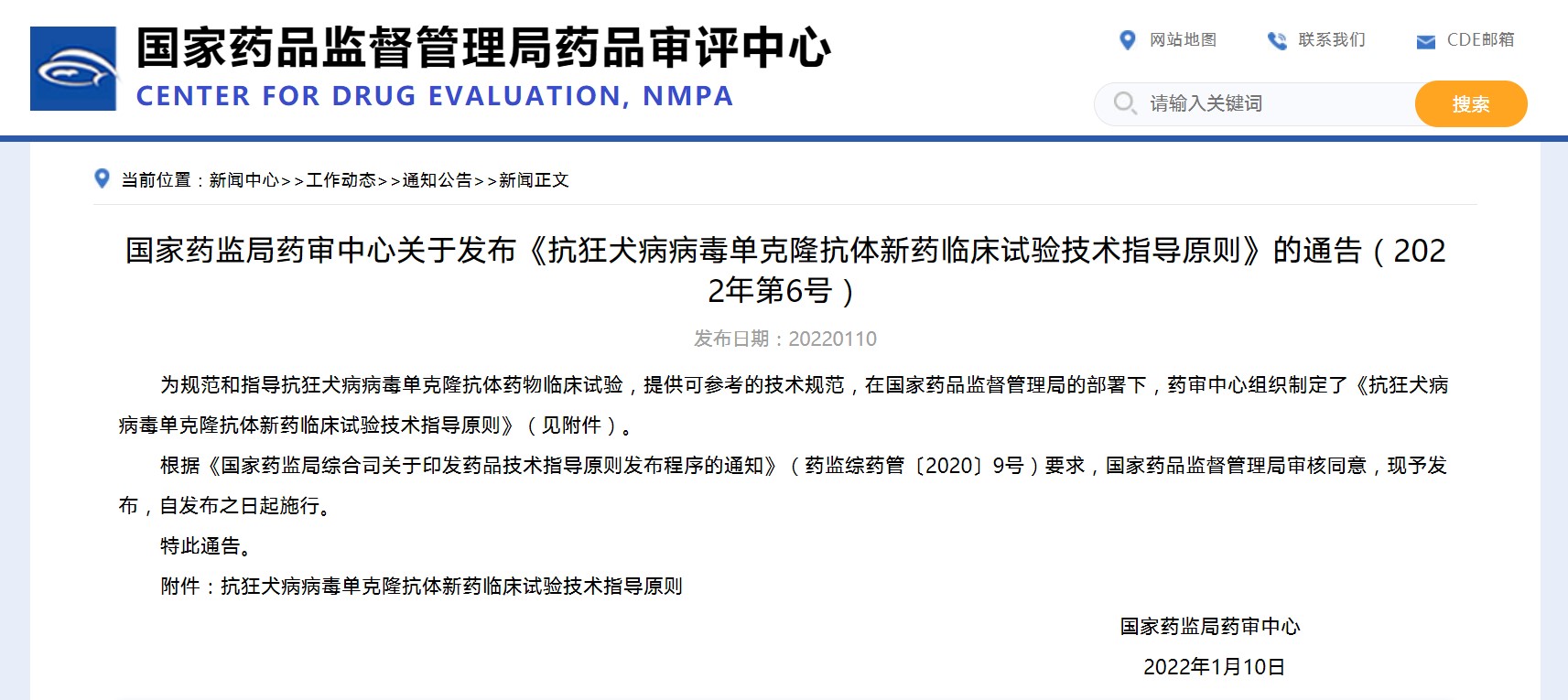 國家藥監(jiān)局藥審中心關于發(fā)布《抗狂犬病病毒單克隆抗體新藥臨床試驗技術指導原則》的通告(2022年第6號)