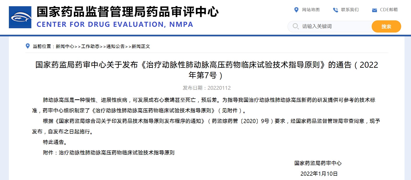 國家藥監(jiān)局藥審中心關于發(fā)布《治療動脈性肺動脈高壓藥物臨床試驗技術指導原則》的通告(2022年第7號)