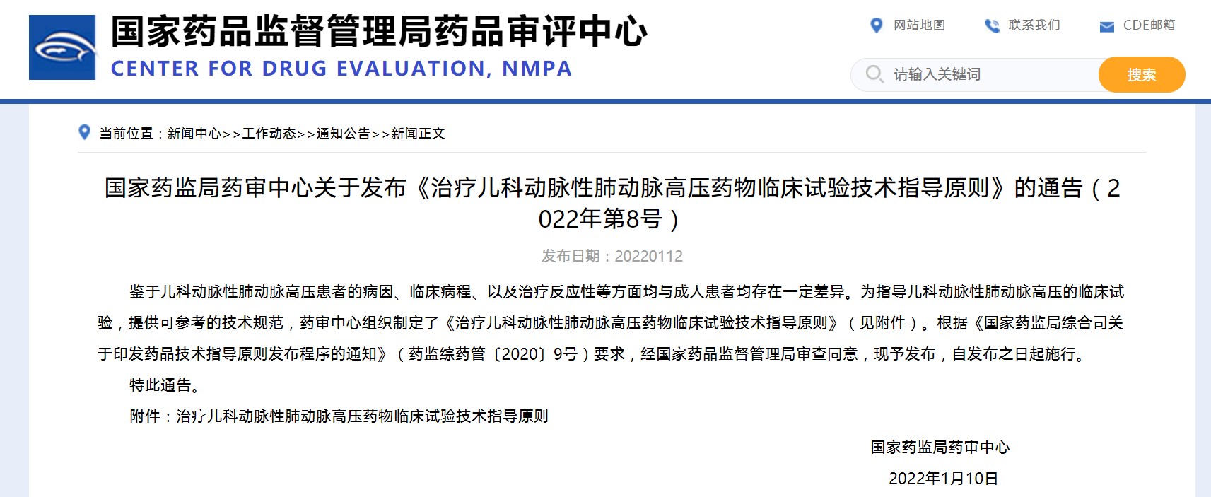 國家藥監(jiān)局藥審中心關于發(fā)布《治療兒科動脈性肺動脈高壓藥物臨床試驗技術指導原則》的通告(2022年第8號)