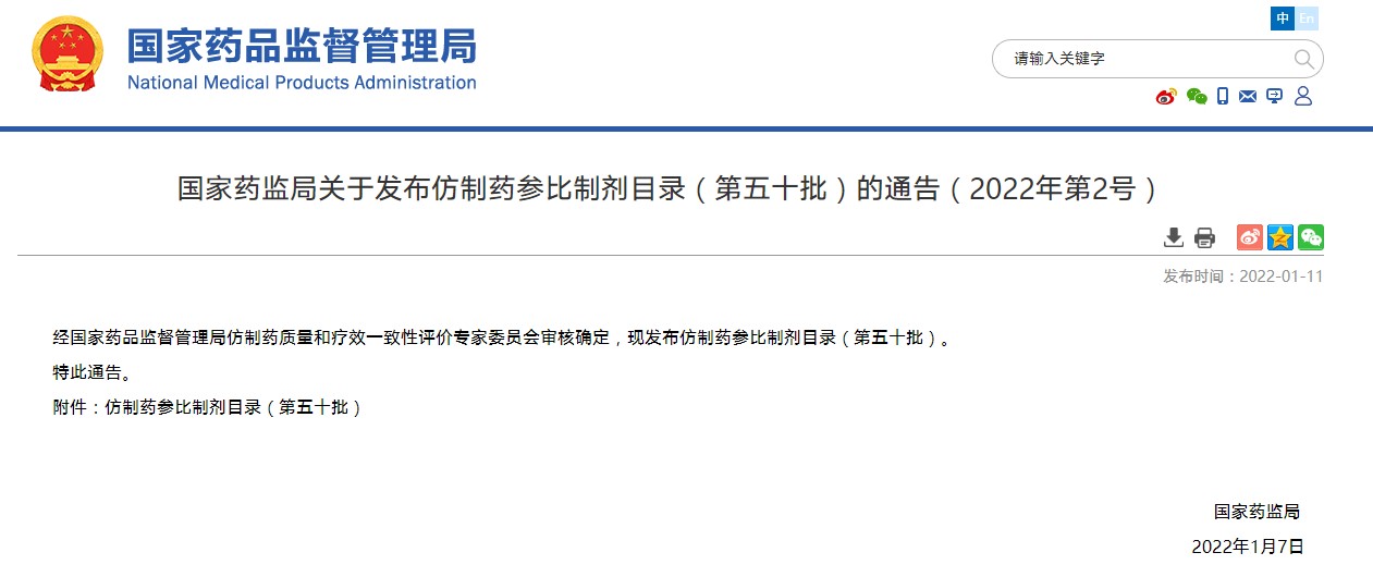 國家藥監(jiān)局關于發(fā)布仿制藥參比制劑目錄(第五十批)的通告(2022年第2號)